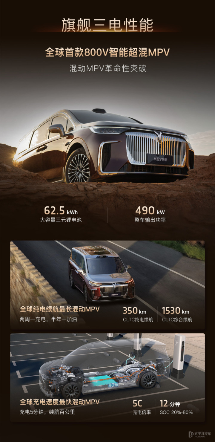 插混版纯电续航350公里,综合续航1531公里,63千瓦时电池组,支持5C超充,SOC由20%充至80%需12分钟。(文:太平洋汽车彭浚哲)