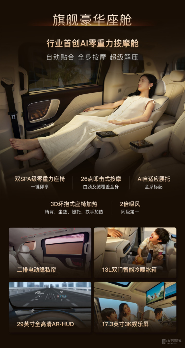 第二排配备双“零重力座椅”,拥有3D加热功能,腿托、坐垫、靠背和扶手都能单独加热,乘坐舒适度拉满,通风和按摩也统一配齐。