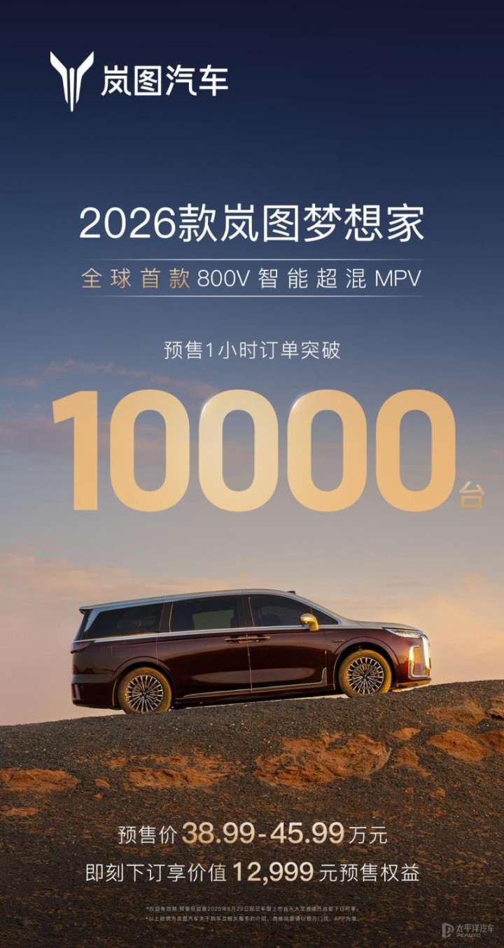 9月8日,我们从岚图汽车官方获悉,2026款岚图梦想家将于9月15日上市,新车已在成都车展上开启预售,预售价区间38.99-45.99万元。