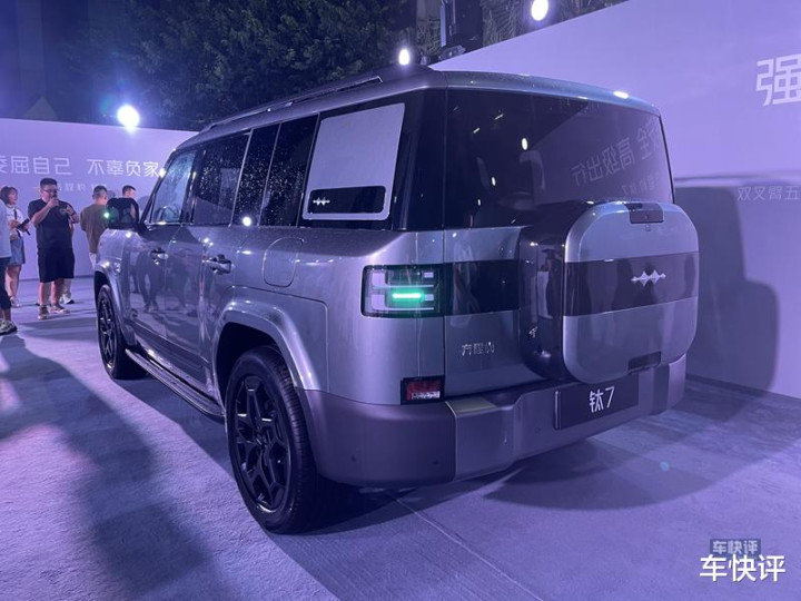 从侧面看车身也显得比较方正,车顶配备有黑色的行李架,多个部位也都有黑色元素的点缀。虽然是一台标准的新能源车,但是钛7仍然采用了传统门把手,还配备有脚踏,有点路虎卫士的感觉。在气质这块,可以说拿捏的相当到位。